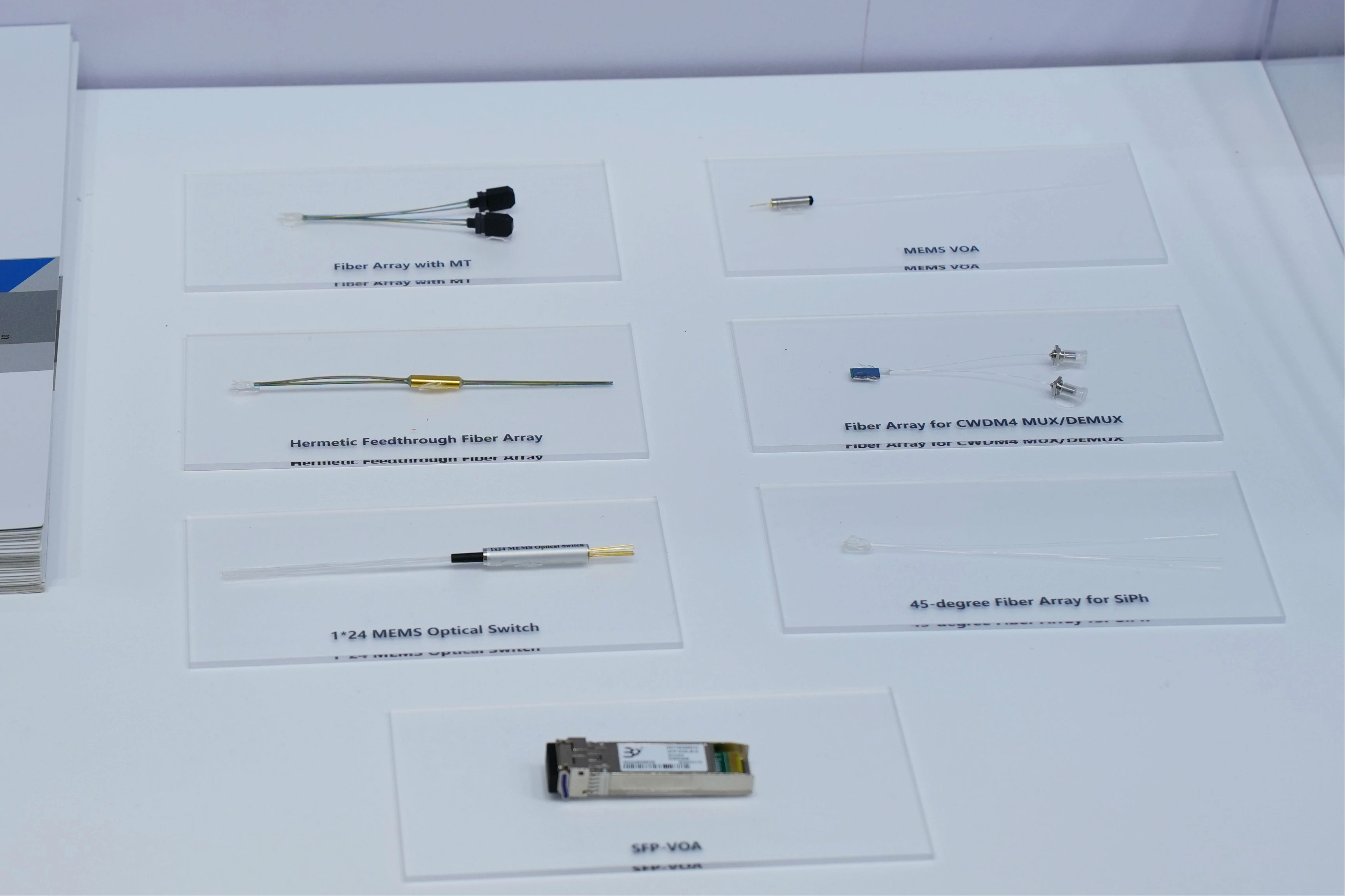Relying on its independently developed four major technology platforms of planar lightwave circuits (PLC), micro-opto-electro-mechanical systems (MEMS), silicon photonics and high-speed active module packaging, EverProX has built a full industrial chain capability covering design, manufacturing and testing. This exhibition focuses on showcasing arrayed waveguide gratings (AWG) for wavelength division multiplexing, variable optical multiplexers (VMUX), variable optical attenuators (VOA), fiber arrays (Fiber Array), etc. The quality of all products exceeds various industry standards and strict quality requirements, empowering the development of the optical communication field with technological strength and quality assurance.